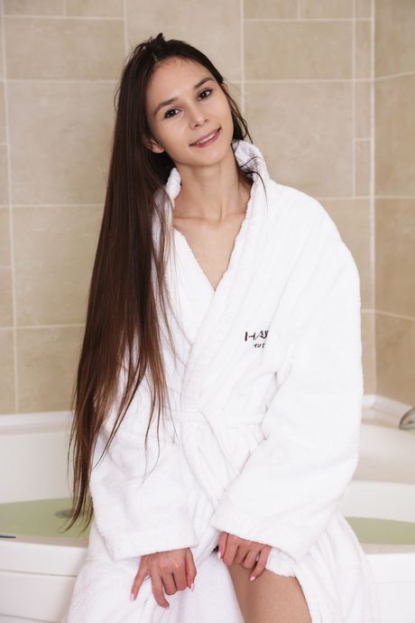 Pretty teen Leona A masturbates in the shower while wearing a bathrobe