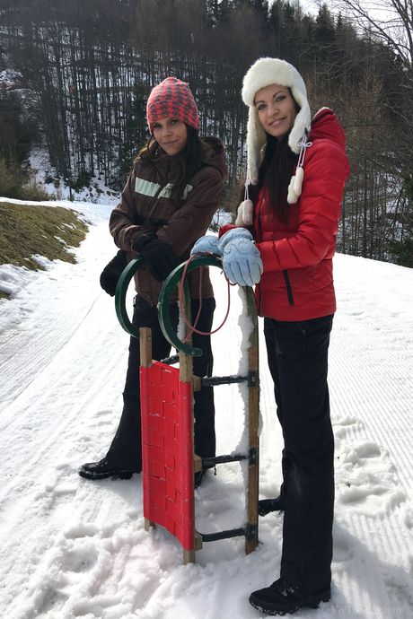 Russian lovelys Linda Moretti and Verona Sky have lesbian sex on a sofa