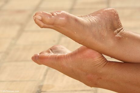 Sandy D and Vendula A oiled up and posing nude in the pool