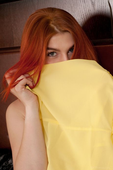 Sexy redhead Mona A strips to her socks and fingers her pussy