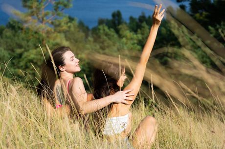 Teen lesbians Foxy Alissa & Hayli Sanders lick each others hairy pussy on a patio
