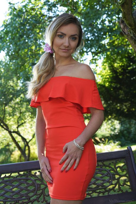 Victoria Puppy takes off her orange dress and panties and starts to masturbate