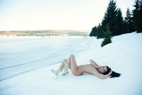 Cute teen Sweet Lady takes off her jeans to pose nude in the snow