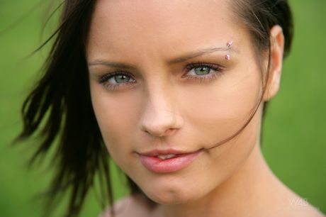 Dark haired teen Kari models totally naked in a field of tall grass
