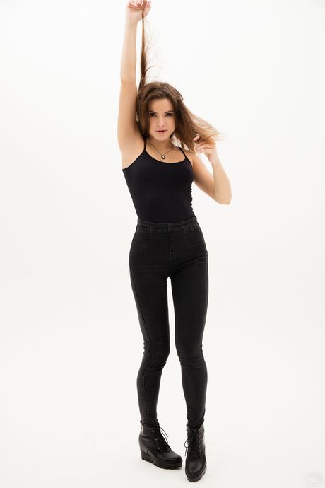 Delicate teen Evelina strips and toys her pussy with a dildo in a solo