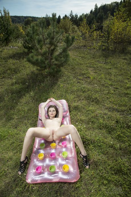 Delicate teen Serena gets totally naked on a mattress while outdoors in the yard
