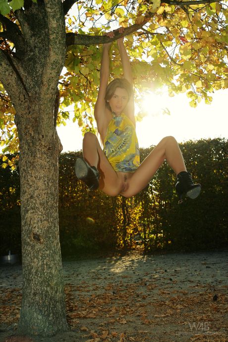 Glamorous teen Monicca strips her dress and exposes herself in the autumn leaves
