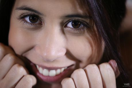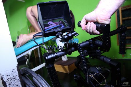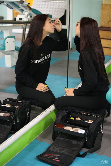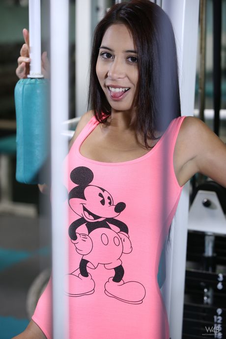 Magnetic teen Paula Shy strips naked and poses on a gym bench while working out