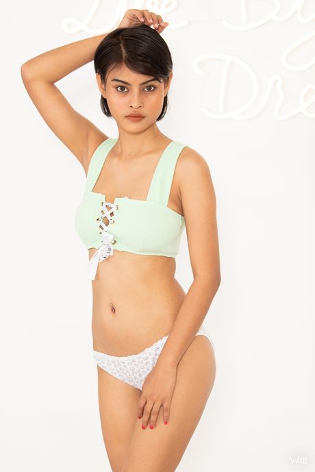 Sexy Asian teen Meng shows her great tits and oily body in a solo