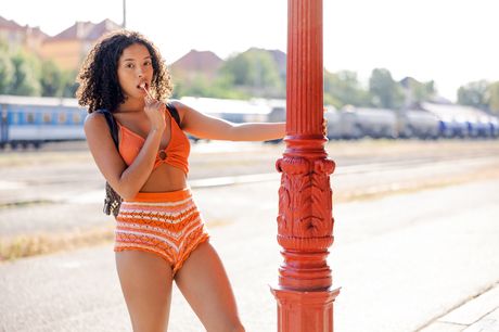 Sexy Latina Valery Ponce shows her hairy pussy and poses on a train