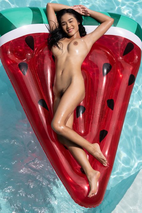 Skinny Asian teen Kahlisa takes off her bikini and oils her body outdoors