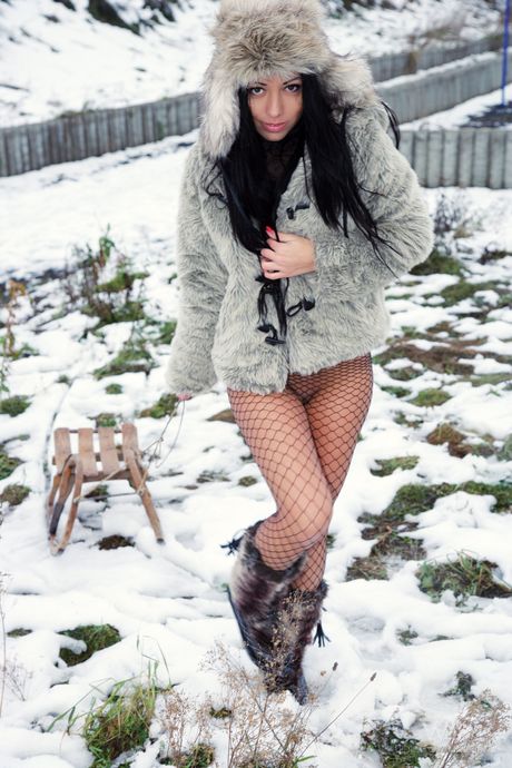Tempting teen Bailey removes fishnets to pose nude on a backyard swing