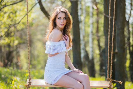 Met Art: Alluring teen Cara Mell removes a white dress to pose nude on a swing