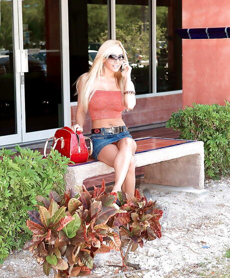 Score Land: Appealing american hottie Lexxi Tyler in fancy skirt shows big hooters and cute pussy outdoor