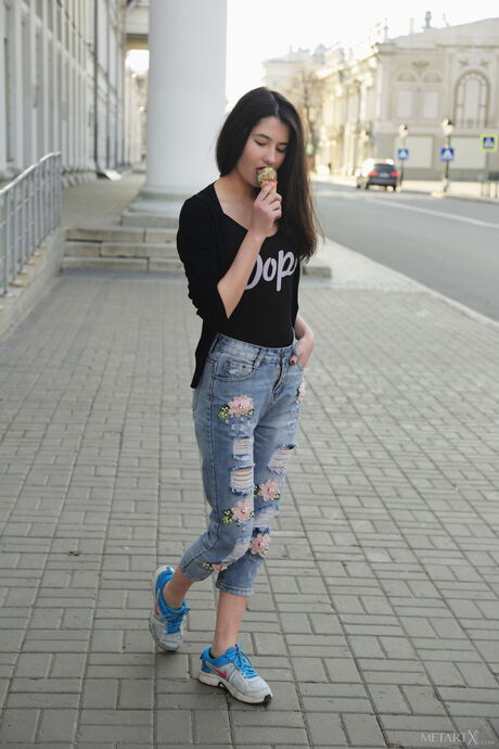 Met Art X: Beautiful teen Melisia removes her bodysuit before fingering her pussy outdoors