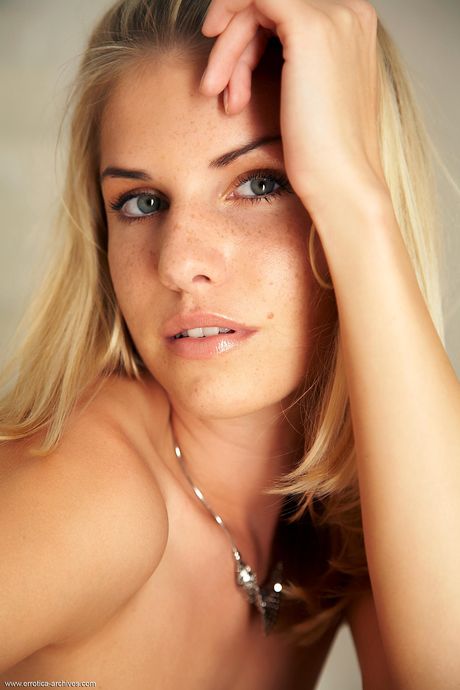 Errotica Archives: Blonde teen Iveta strikes great nude poses in high heels on a staircase