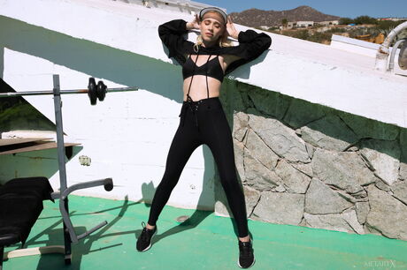 Met Art X: Blonde teen Riley Anne strips down on a weights bench in a backyard