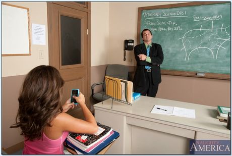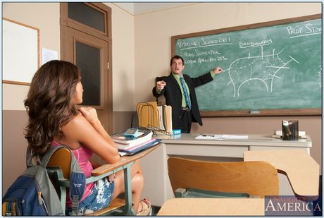 Naughty America: Brunette coed Lizz Tayler strips and shows her shaved pussy in class