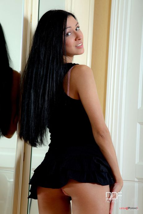 Porn World: Brunette with small tits Elizabeth toys her shaved pussy in a solo