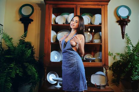 Met Art: Cute teen Li Moon removes her rubber gloves while doing the dishes