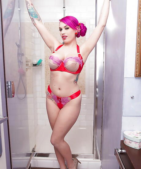 Score Land: Delightful british redheaded hottie Lily Madison baring big boobies and playing with sex toy in shower