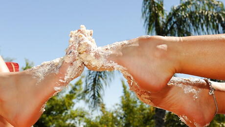 Club Sandy: Deluxe women Sandy and Monique Alexander in fancy skirt licking tasty pussies in the hot lesbian sex outside
