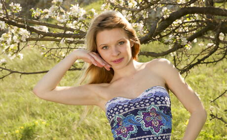 Met Art: Excellent blond teen Malinda A in nice skirt bares small tits and spreads her legs outdoor