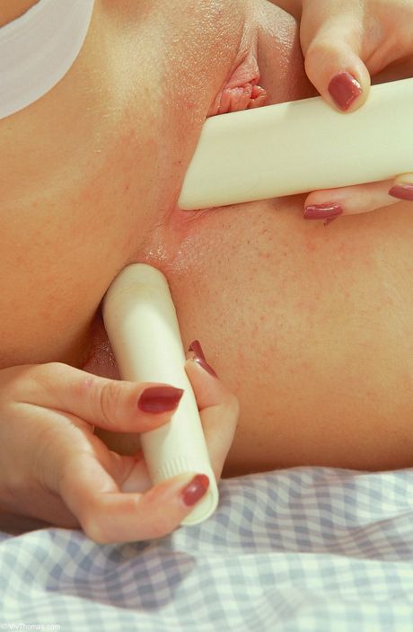 Viv Thomas: Hot teen lesbians Mia Stone & Vera A have sex with a glass dildo on a table