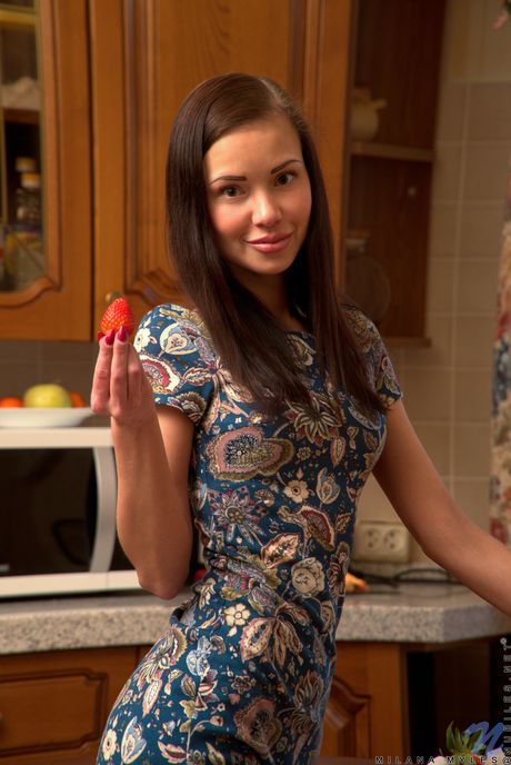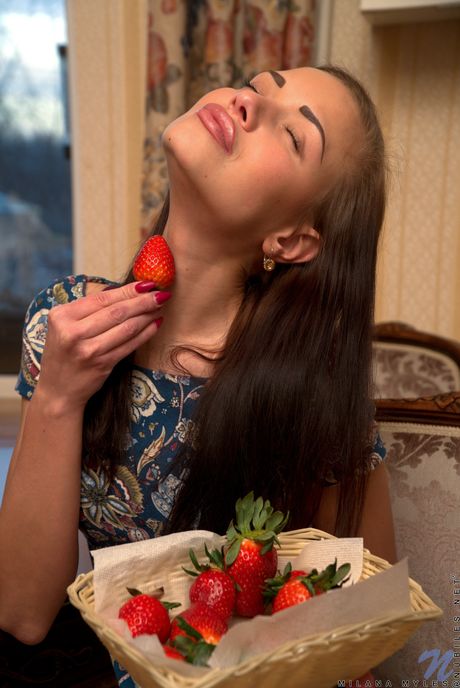 Nubiles: Lean teen Milana Myles toys her tight pussy with a strawberry