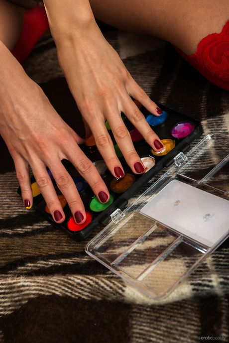 Erotic Beauty: Lean teen Natya covers her nude body with paint while posing in red stockings