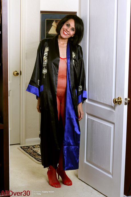 All Over 30: Mature woman Gypsy Vixen removes a red bodystocking to get naked