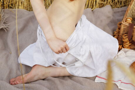 Met Art: Pale redhead Jia Lissa gets naked in a field of wheat while wearing pigtails