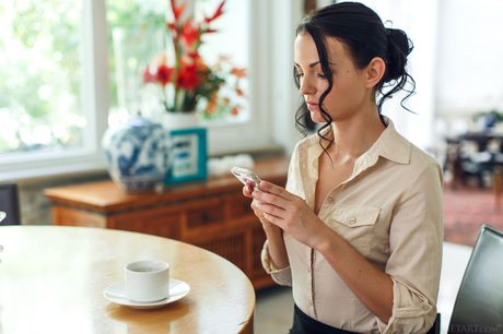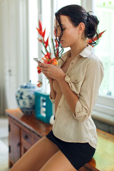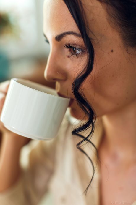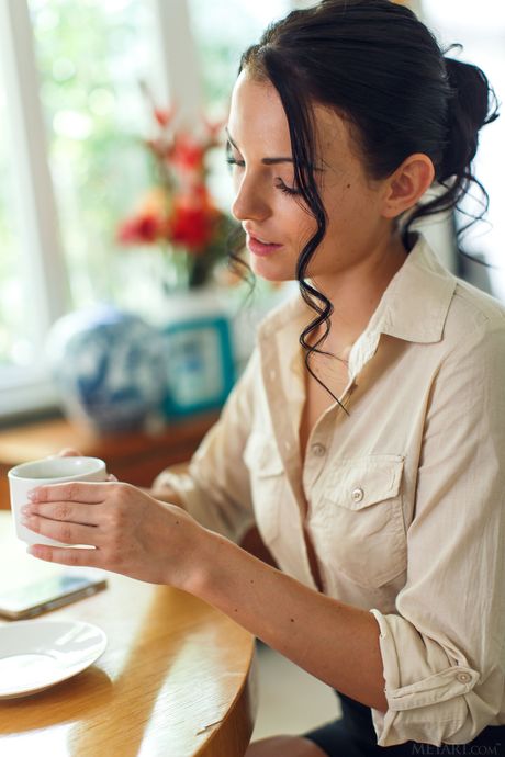Met Art: Sapphira A is getting ready for work, but distracts herself with coffee, texts