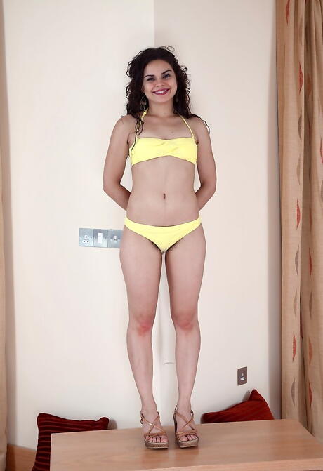 We Are Hairy: Sexy american dark hair cutie Sierra in beautiful bikini exhibiting tiny tits and spreading her legs