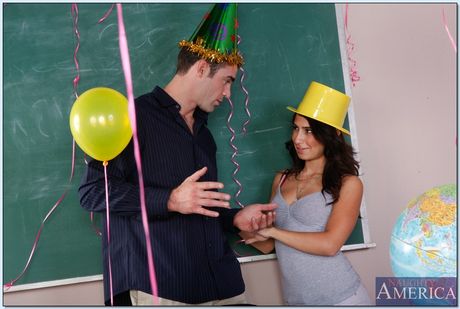 Naughty America: Sexy brunette Allie Jordan strips and shows her shaved pussy in class