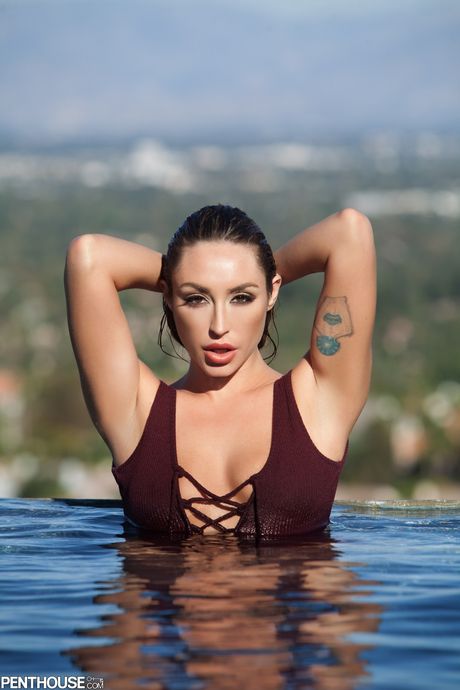 Penthouse Gold: Sexy brunette Christiana Cinn strips off her bikini and exhibits perfect body by the pool