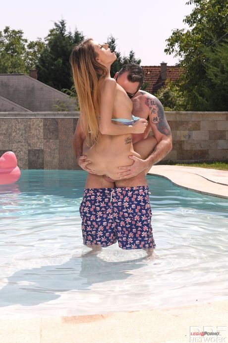 Porn World: Sexy brunette Rebecca Volpetti seduces her man friend in a bikini and heels