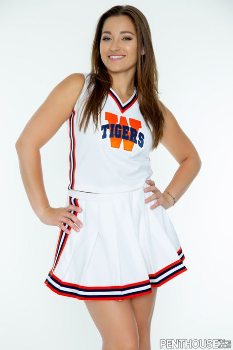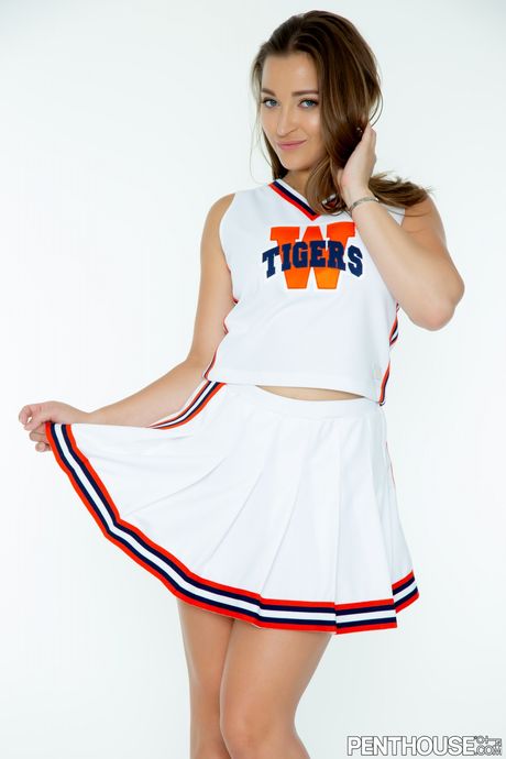 Penthouse Gold: Sexy cheerleader Dani Daniels strips her uniform and shows her sexy tits