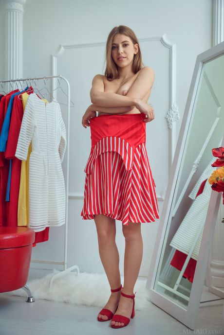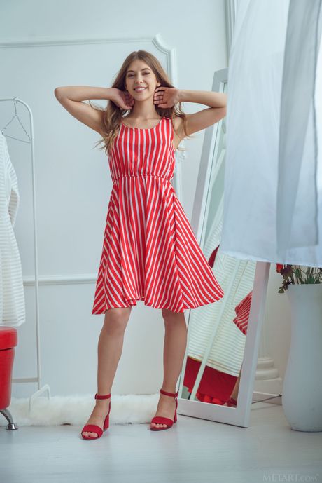 Met Art: Slender teen Avery strips & shows her tiny tits & shaved pussy in a solo