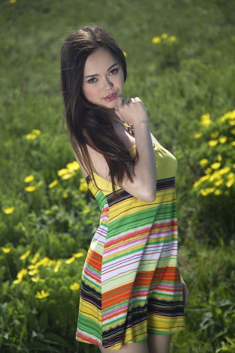 Met Art: Slender teen Li Moon shows her small tits & poses nude in a field