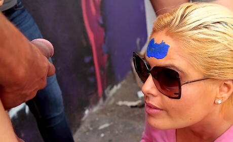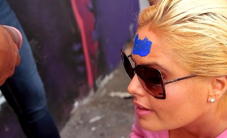 Money Talks: Stunning canadian blonde Cameron Canada in fancy shorts sucks on cock and takes a messy cumshot