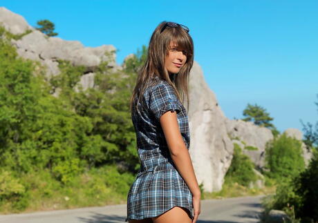 Met Art: Very attractive brunette teen Mia D in nice skirt exposing small tits and bald pussy outside