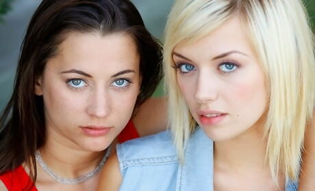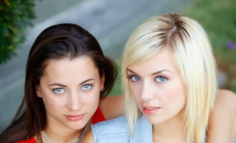 We Live Together: Very attractive girls Emma Mae, Dani Daniels and Georgia Jones enjoy some playful lesbian foreplay outdoor