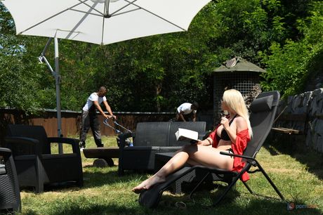 Porn World: Blonde Babe Vinna Reed viene doppiamente scopata da due ragazzi neri nel giardino