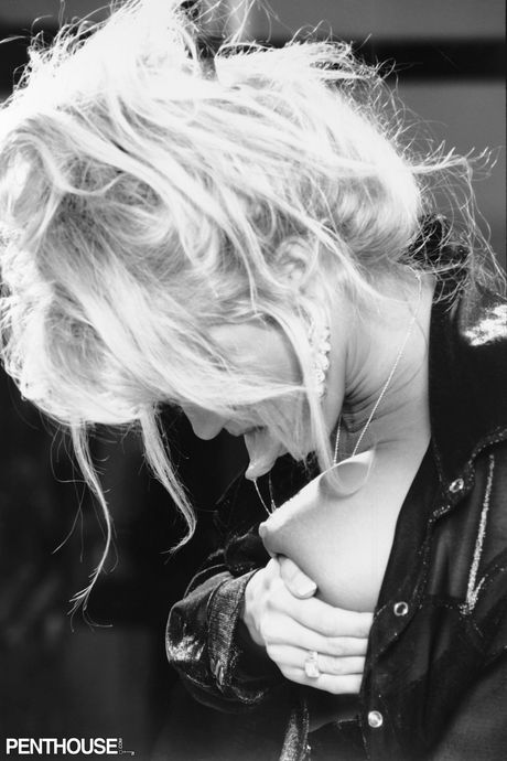 Penthouse Gold: Bionda Centerfold Elizabeth Hilden espone le sue grandi tette e il manicotto su un divano