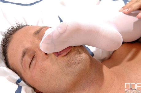 Porn World: Teen Kristine dai capelli rossi dà un footjob e si ottiene i piedi crema