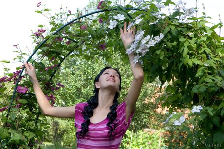 Met Art: Russian Babe Loreen A mostra le sue piccole tette e la figa pelosa in giardino