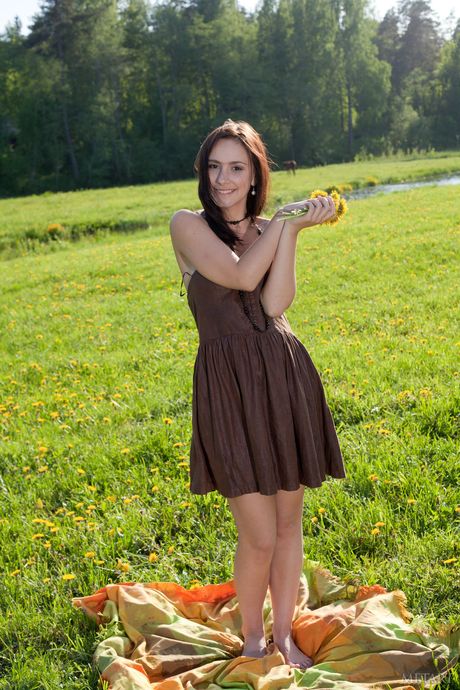 Met Art: Bruna sexy Karina n in abito corto che mostra grandi tette e figa calva nel campo