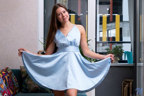 Nubiles: Top Girl Miledy rimuove un vestito nero prima di diteggiare la figa su un divano