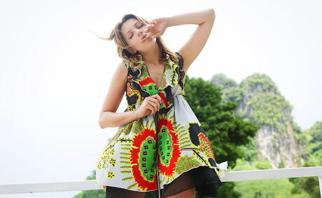 Eternal Desire: Teen Niki Mey molto attraente in gonna fantasiosa espone il sedere e la figa pelosa all'aperto